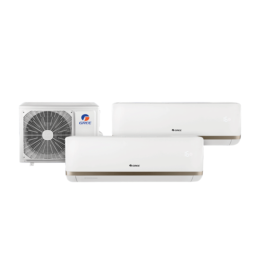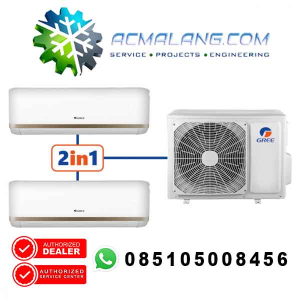 AC Gree Combo Split berkemampuan menghidupkan 2 unit indoor dengan 1 unit outdoor. Miliki tiga kelebihan yaitu hemat ruang, hemat energi, dan hemat listrik. Memakai freon R-32, teknologi inverter G-1Hz, dan teknologi fast-cooling.
