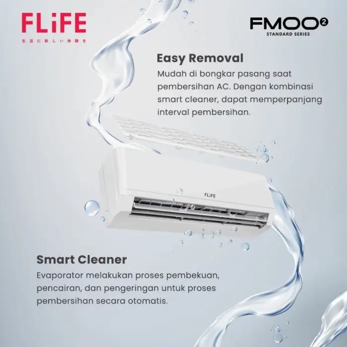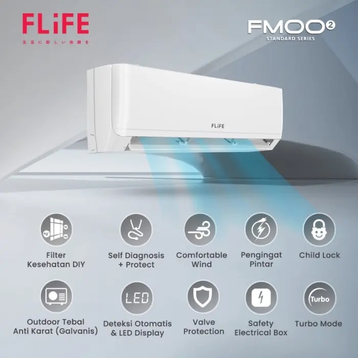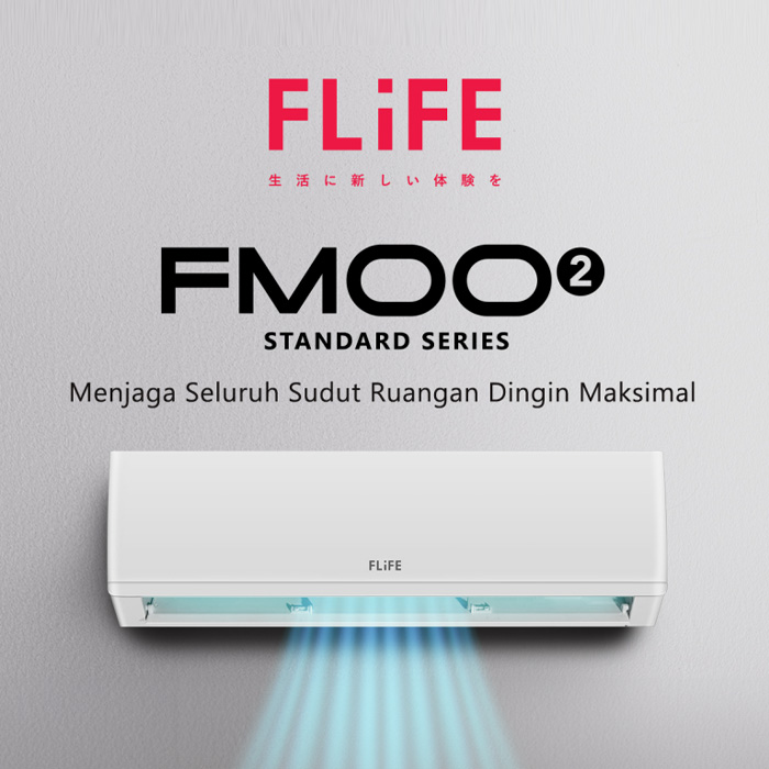 AC FLiFE adalah sebuah produk AC terbaru powered by GREE. Dilengkapi dengan fitur smart cleaner yang mampu membersihkan AC secara otomatis serta berdesain filter bagian atas pada AC yang dapat menghindari debu dan kotoran ke dalam indoor AC, sehingga menghasilkan udara yang bersih dan ruangan tetap nyaman. Flife Air Conditioner FMOO2 Standard Series juga memiliki daya rendah yaitu hanya 360 watt saja. Dengan daya listrik yang rendah dan fitur terbaik, membuat Flife Air Conditioner FMOO2 Standard Series tetap dapat memberikan udara bersih yang berkualitas, ruangan yang nyaman, tanpa mengeluarkan biaya listrik yang tinggi dan harga sangat terjangkau.