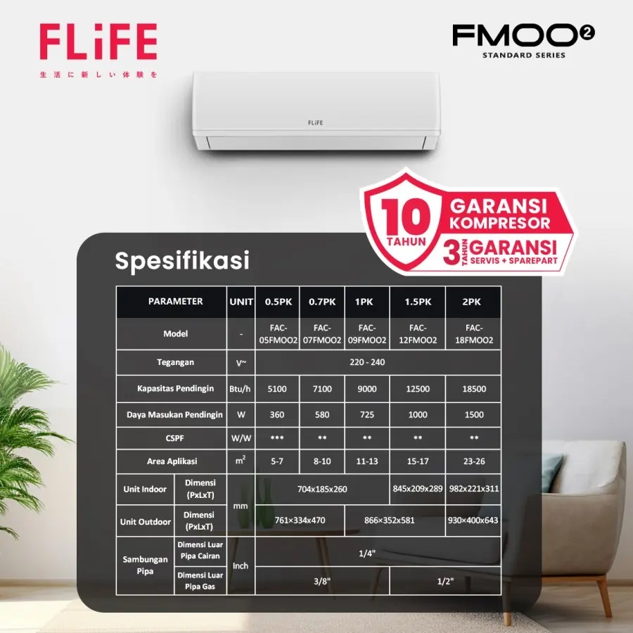 AC FLiFE memiliki kapasitas mulai dari 0.5PK, 1PK, 1.5PK, dan 2PK dengan desain yang elegan dan dengan masa Garansi Resmi hingga 10 Tahun.